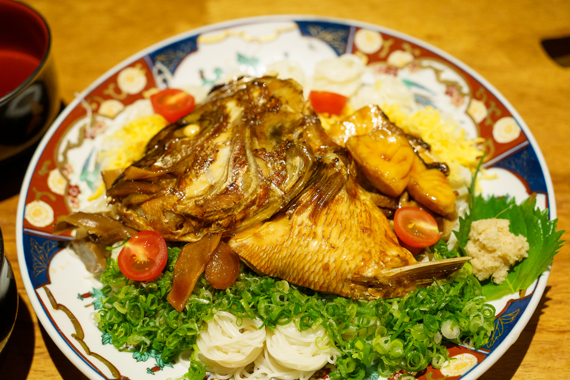つゆが別に出てきたこともあり、最初は鯛は鯛、そうめんはそうめんで食べる料理かと思っていました。ところが、そうではなかった。鯛の甘辛い煮汁とそうめんの相性が抜群。個人的にはつゆが要らないと感じたほどです。