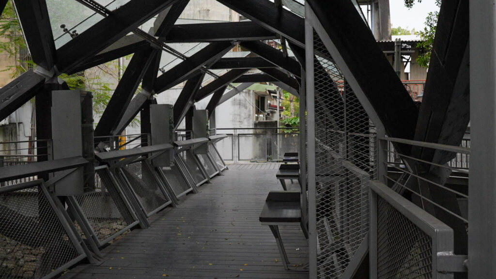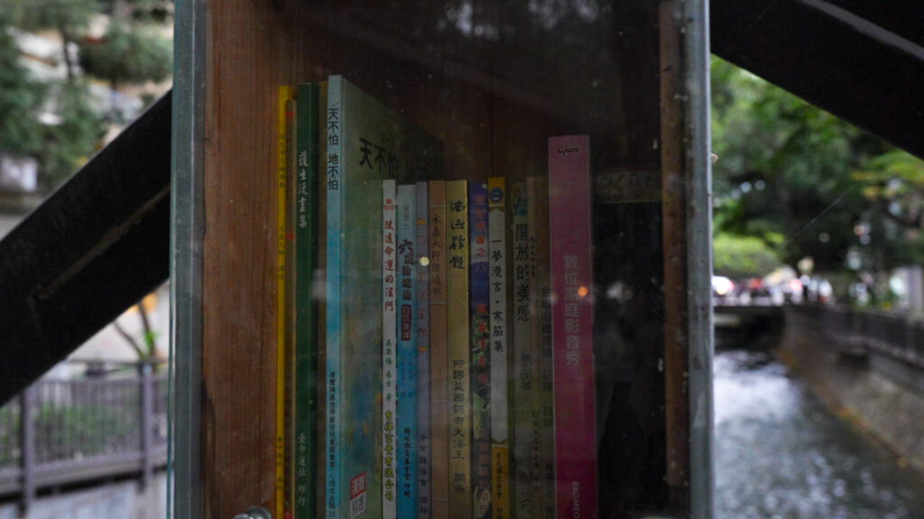 緑川書橋も印象的でした。橋の中間に書棚とベンチがしつらえてありまして、これは座ってゆっくり読書をして行け、という趣向と思われます。もちろん置いてある書籍は中文なので私はスルーしました。