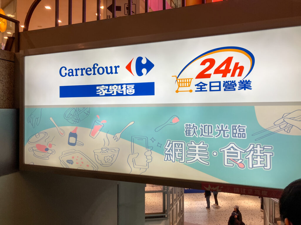 スターバックスやマクドナルドといった世界的チェーン店が入っているのですが、私の目的は地下2階にある家楽福(カルフール)。ペットボトルのお茶やお菓子類を買い込む場所として有用でした。パンも安くておいしかった。惣菜と弁当はいまいち。
