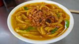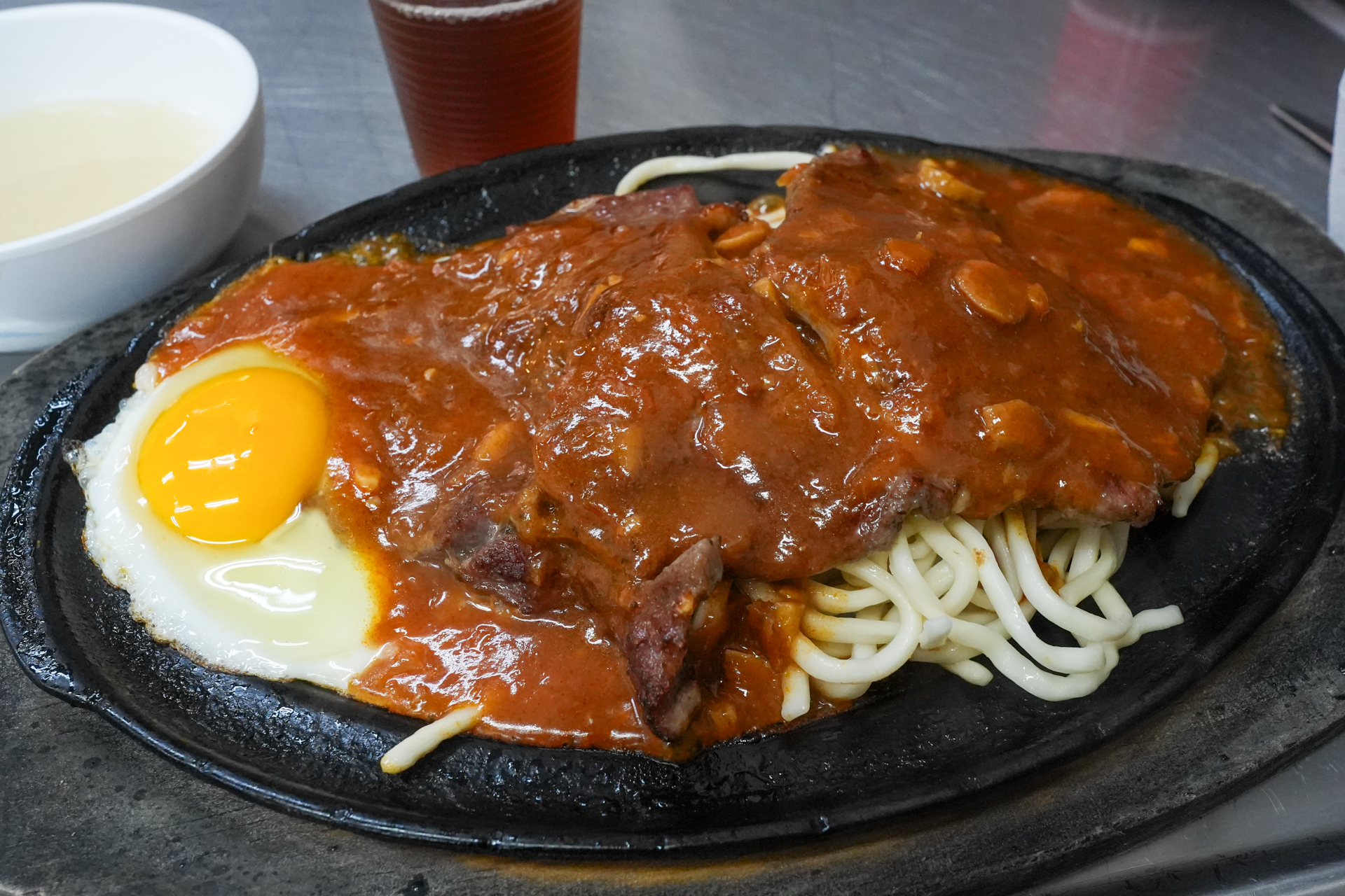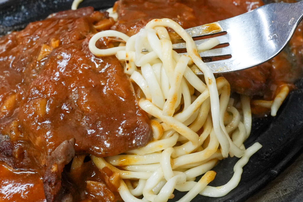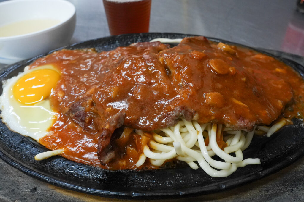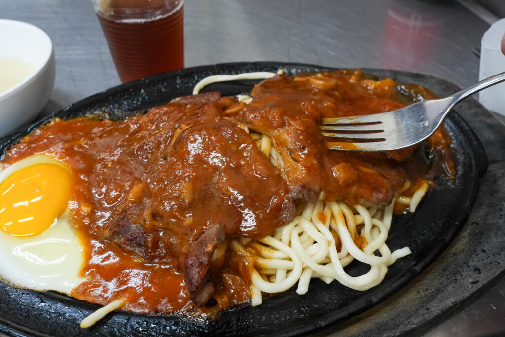 そして肉の下にたっぷり敷かれたパスタ……と言って良いのかなこの麺(パスタではなく「鐵板麵」という中華麺やうどんを使った定番の付け合わせ)。軽くソースがからんで実にうまい。加えて、鉄皿が作り出す軽い焦げが食欲を増進させます。炭水化物は避けるとかいいつつ完食。屋台なのに今夜は満足度の高いディナーとなりました。
