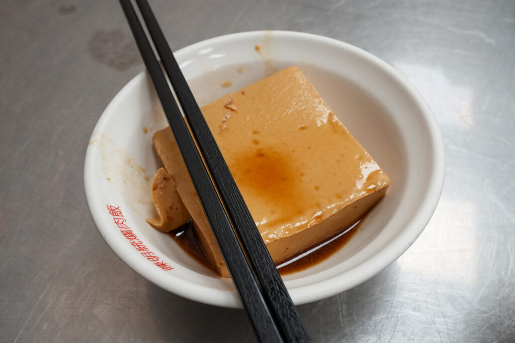 後者の三層はおそらく、皮がついていないバラ肉(沖縄でいうところの三枚肉)だと推察。それだと「山河魯肉飯」の「魯肉飯」とは別物なので、山を張って脚庫をお願いしました。ついでにタンパク質をさらに摂取すべく滷味の豆腐も注文。