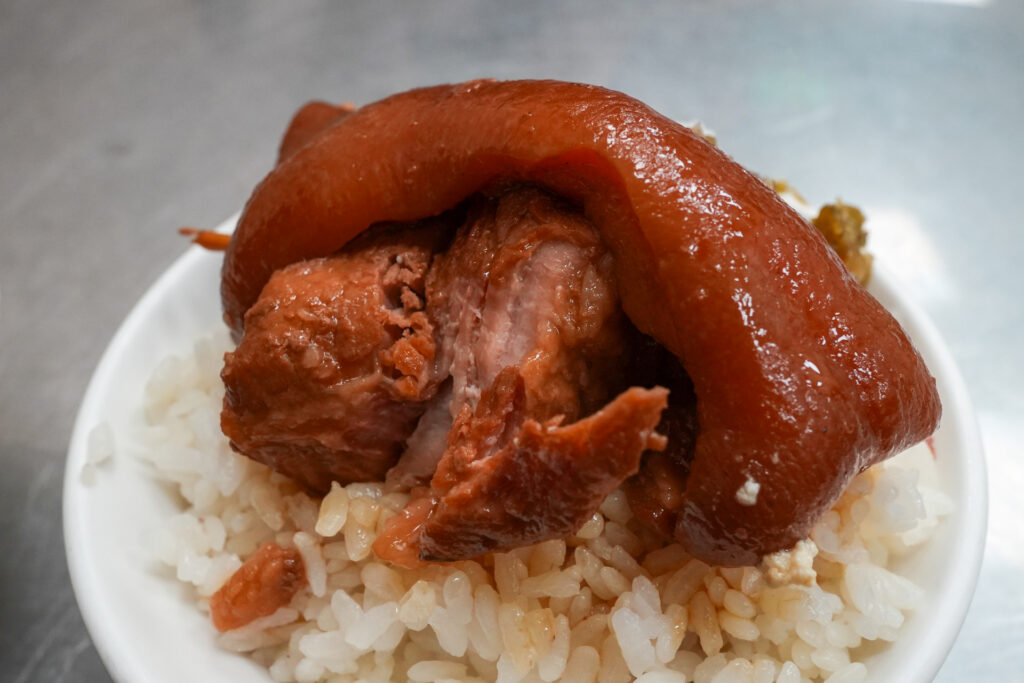 皮の下には、ほろっと崩れる赤身が。肉のうまみが溶け出したような甘辛いタレも雑味がなくて良い味わいです。「山河魯肉飯」に比べ得ると、味がくっきりしている感じ、こちらもご飯によく合っています。